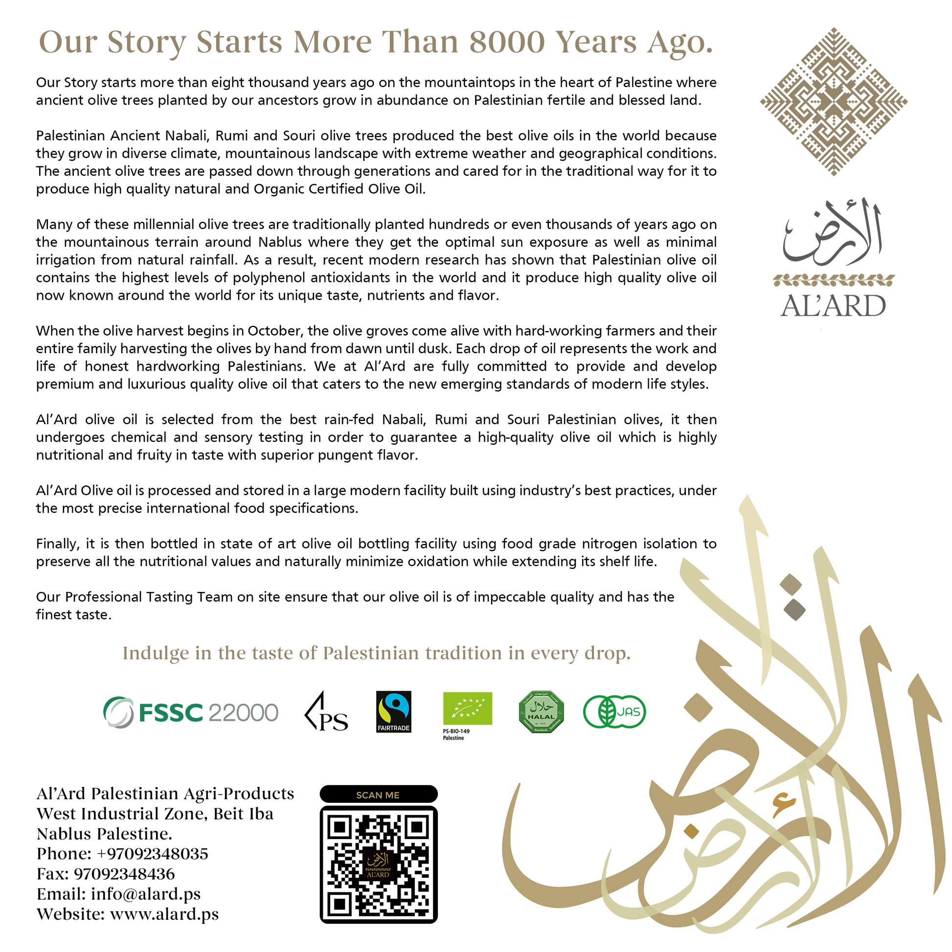 Al’ard Organic Extra Virgin Olive Oil is framed in cooperation with Palestinian farming cooperatives according to Organic farming standards. These standards include but are not limited to avoiding artificial fertilizers and pesticides while using a limited number of approved products and substances necessary in the processing of organic foods. These practices combines a high level of biodiversity with environmental practices that preserve natural resources, has rigorous standards for animal welfare and works on eliminating pesticide residues in organic foods. To guarantee such practices Al’ard has acquired international accredited quality certifications such as NOB, EU and JAS Organic certifications.